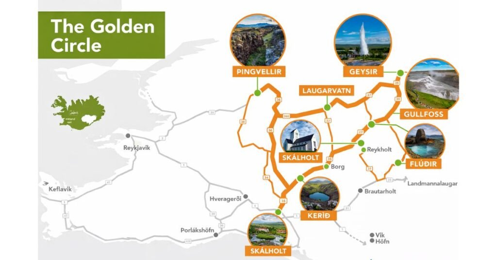 The Golden Circle — Gullni hringurinn in Icelandic — is a roughly triangular scenic route that loops northeast and east of Reykjavík through the Icelandic highlands. The name comes from Gullfoss (“Golden Falls”), the anchor waterfall on the route. On sunny days, the glacial mist above Gullfoss catches the light and throws golden rainbows across the canyon. The “circle” part refers to the loop itself: you can drive it in either direction and return to the capital without backtracking.